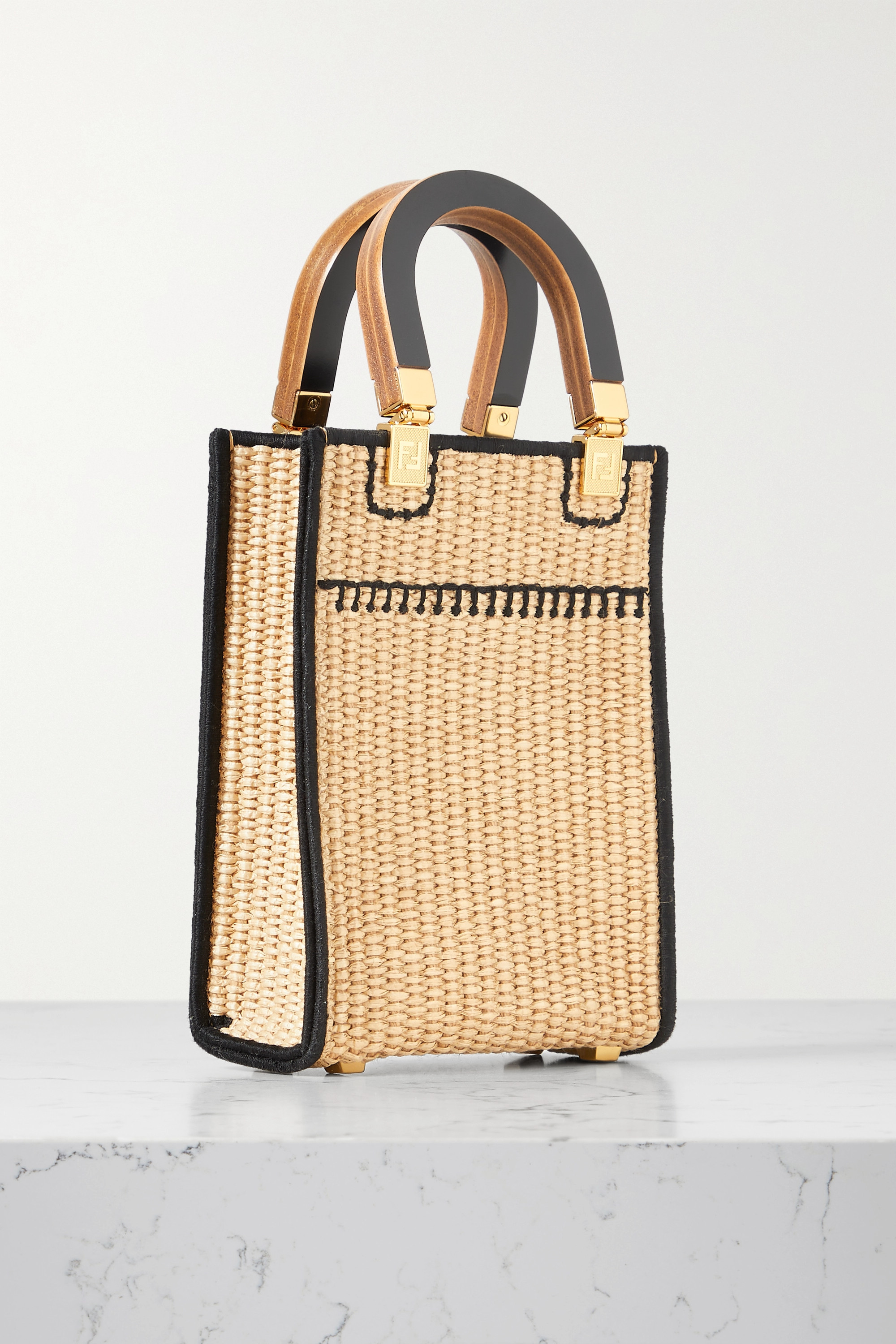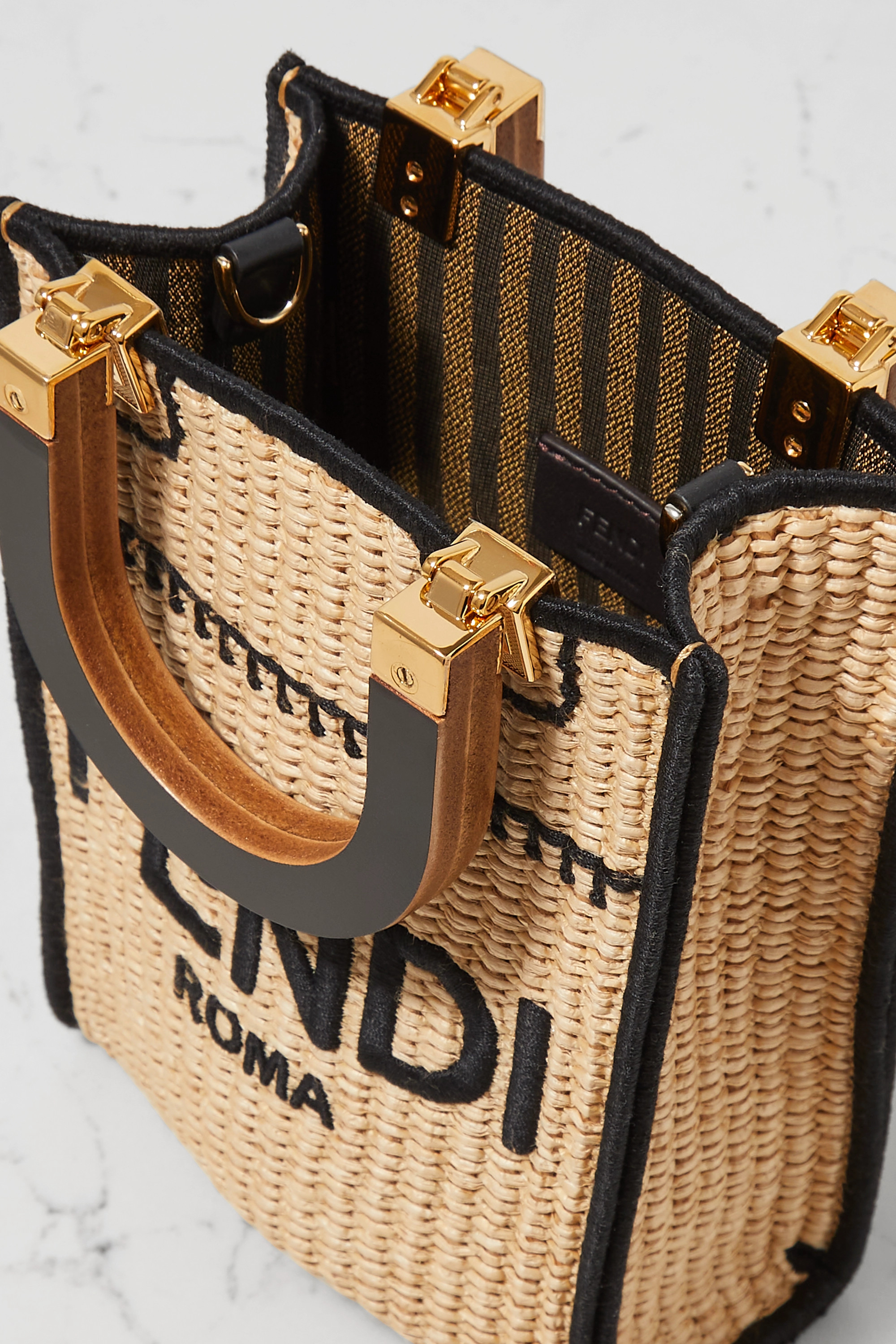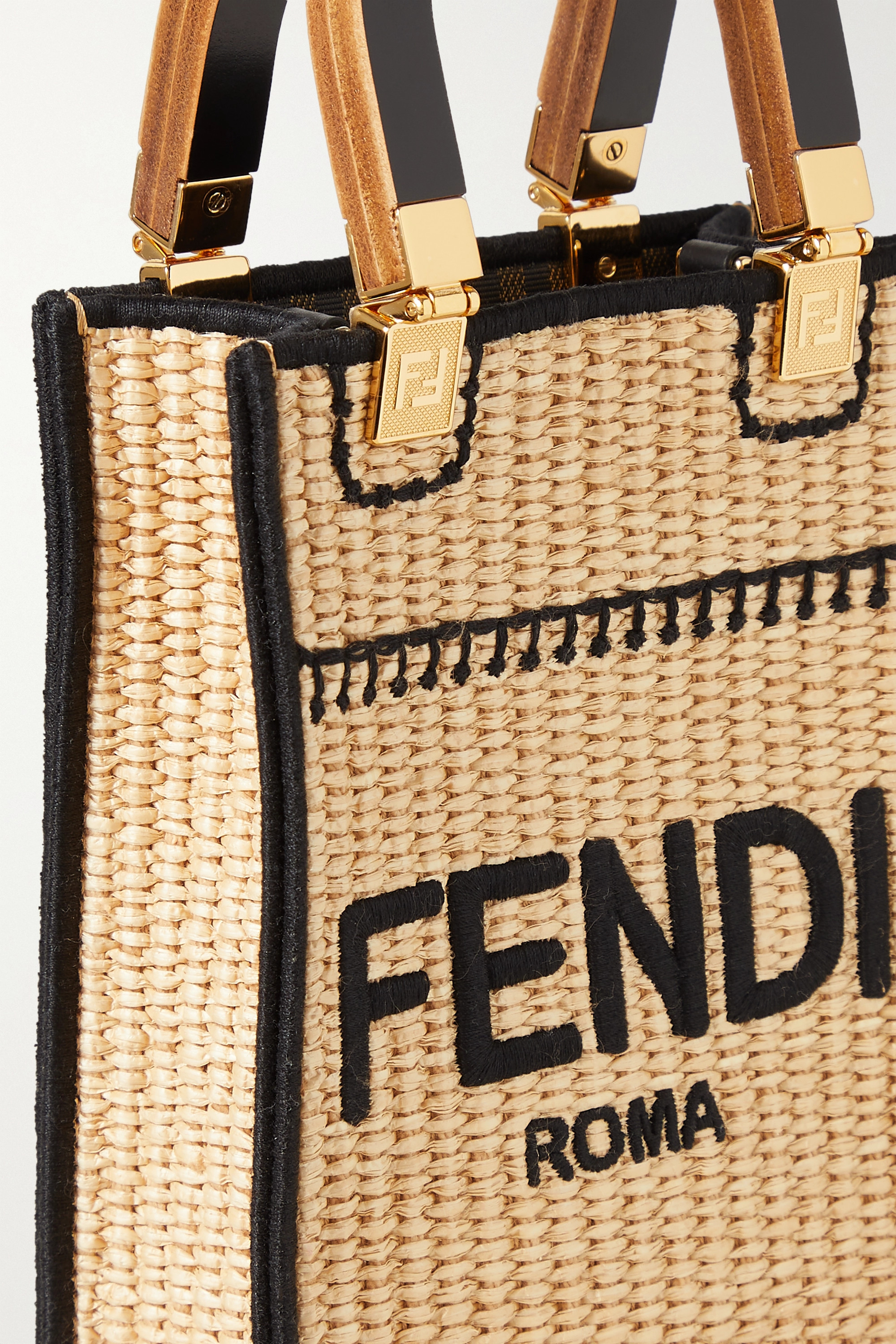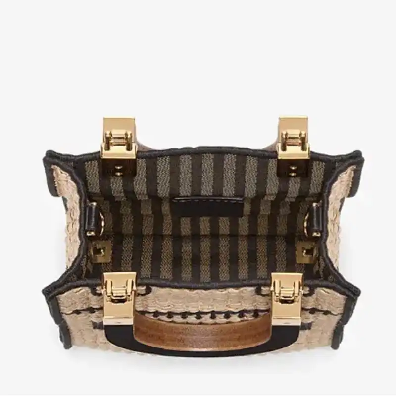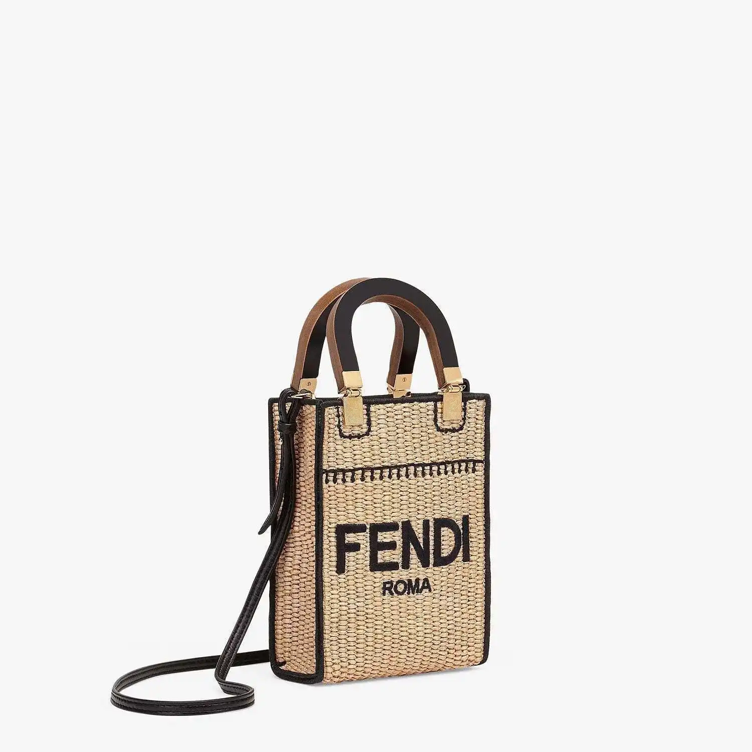 ナチュラルカラーのストロー素材にFENDI ROMAの刺繍を施し ハードなブラックのパテントレザー製ハンドルをあしらった スモールサイズのサンシャイン ショッパー バッグ。
