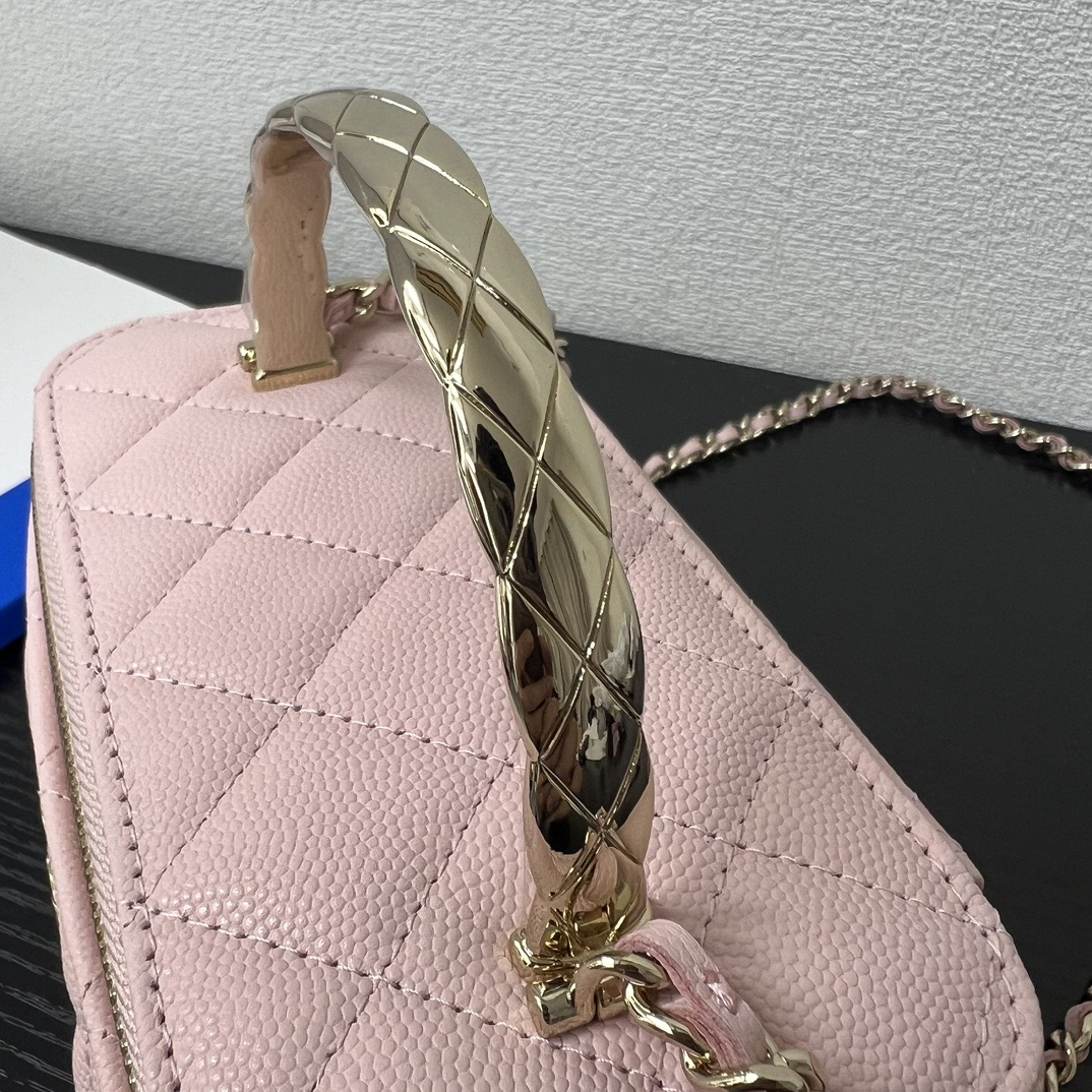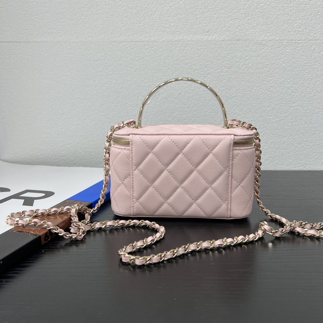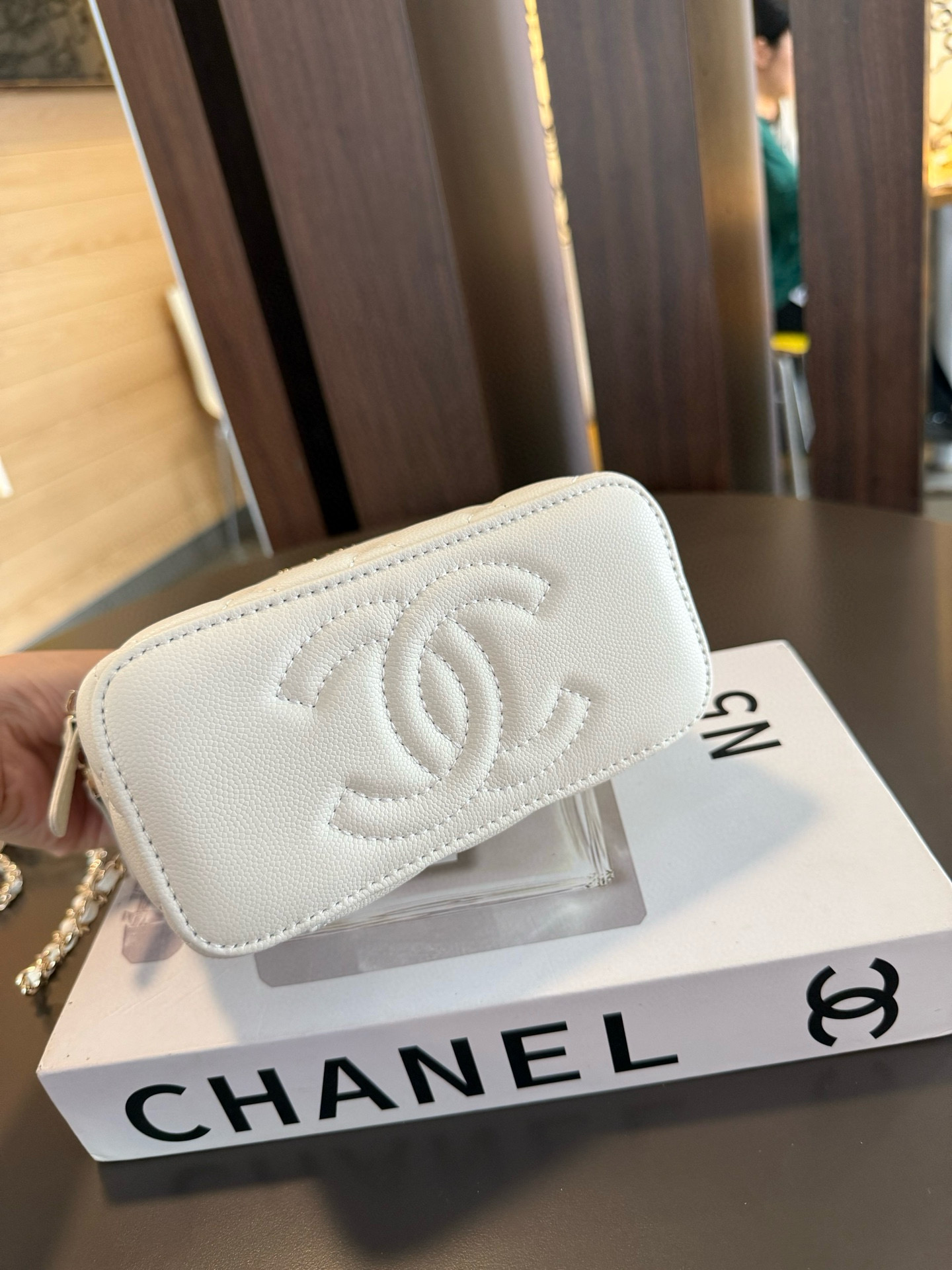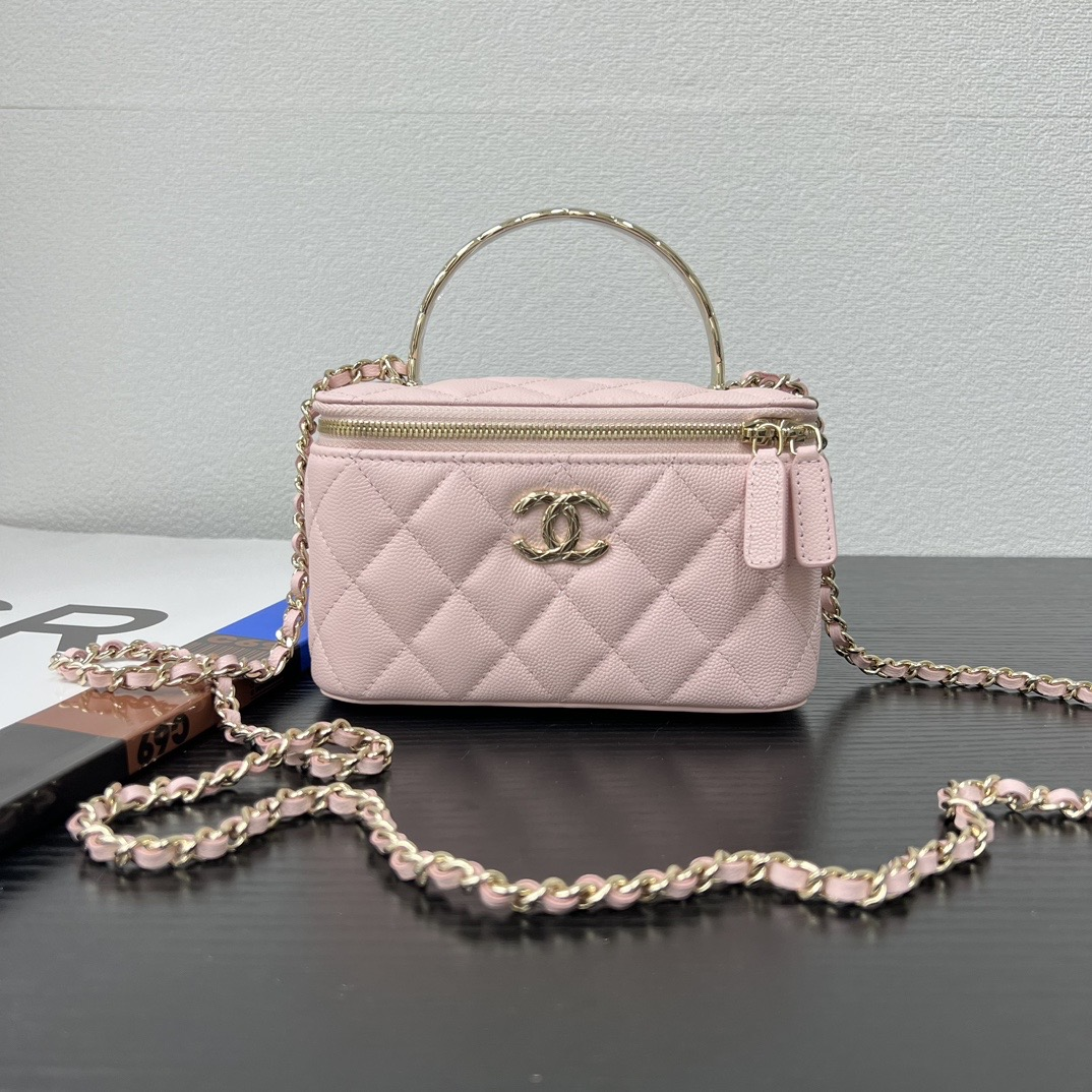 長さ調節不可のレザーとメタルのチェーン、ダブルCロゴは、その伝統を継承し、ボックス型のシルエットが特徴です。