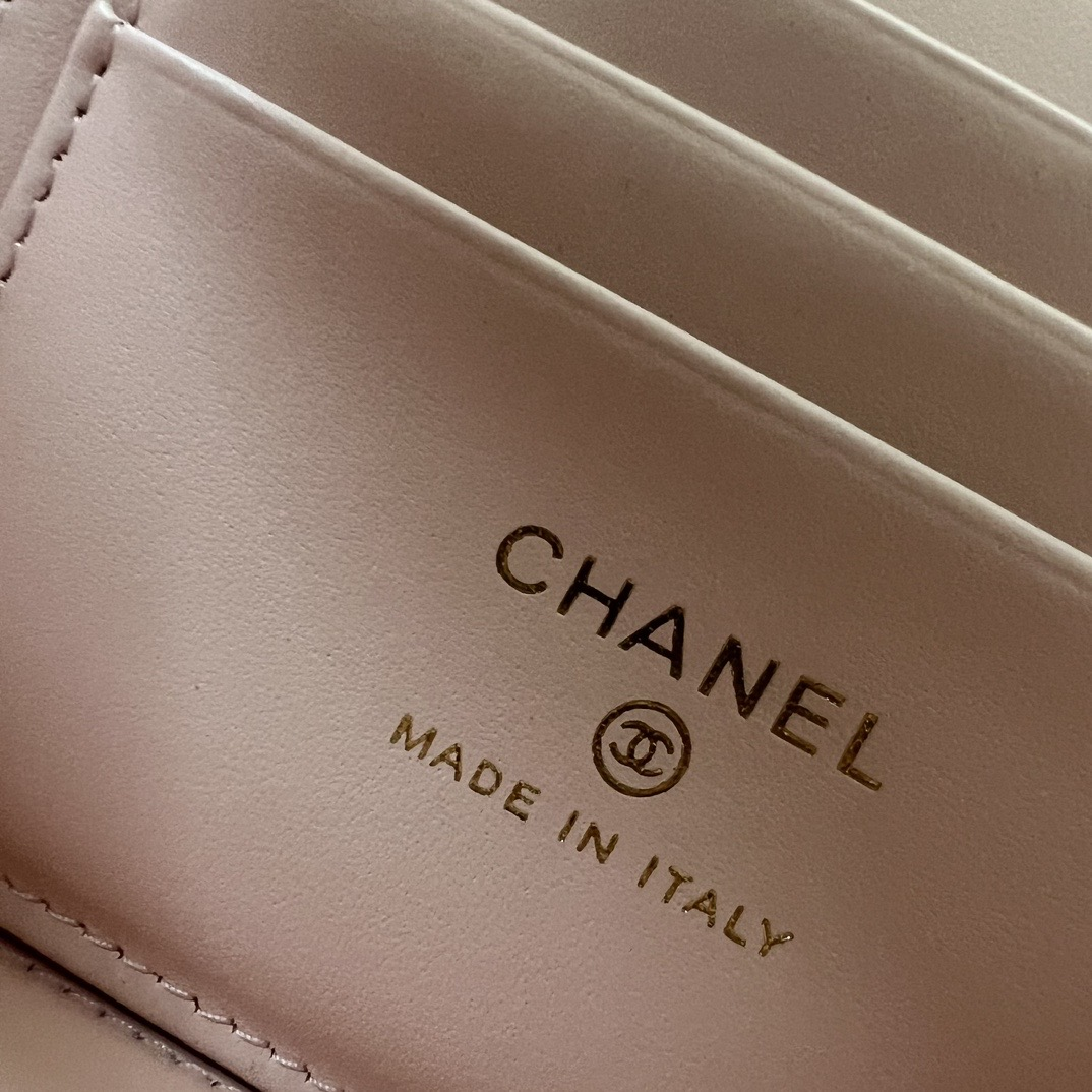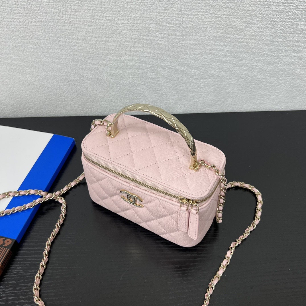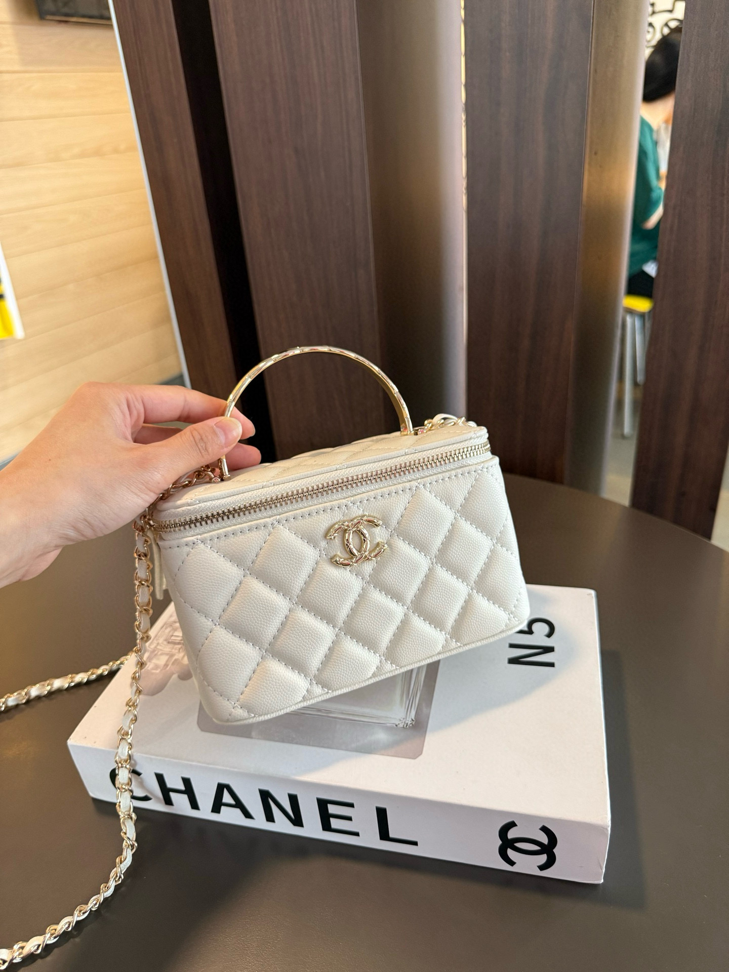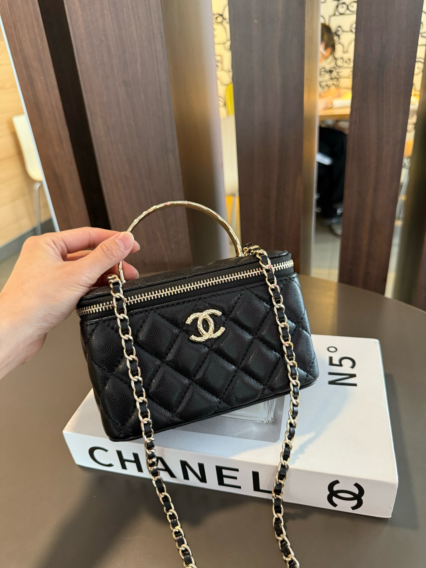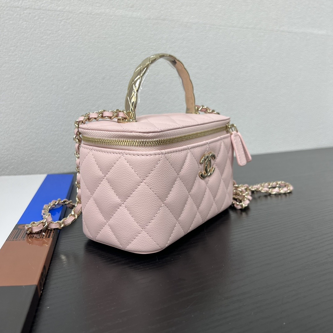 長さ調節不可のレザーとメタルのチェーン、ダブルCロゴは、その伝統を継承し、ボックス型のシルエットが特徴です。
