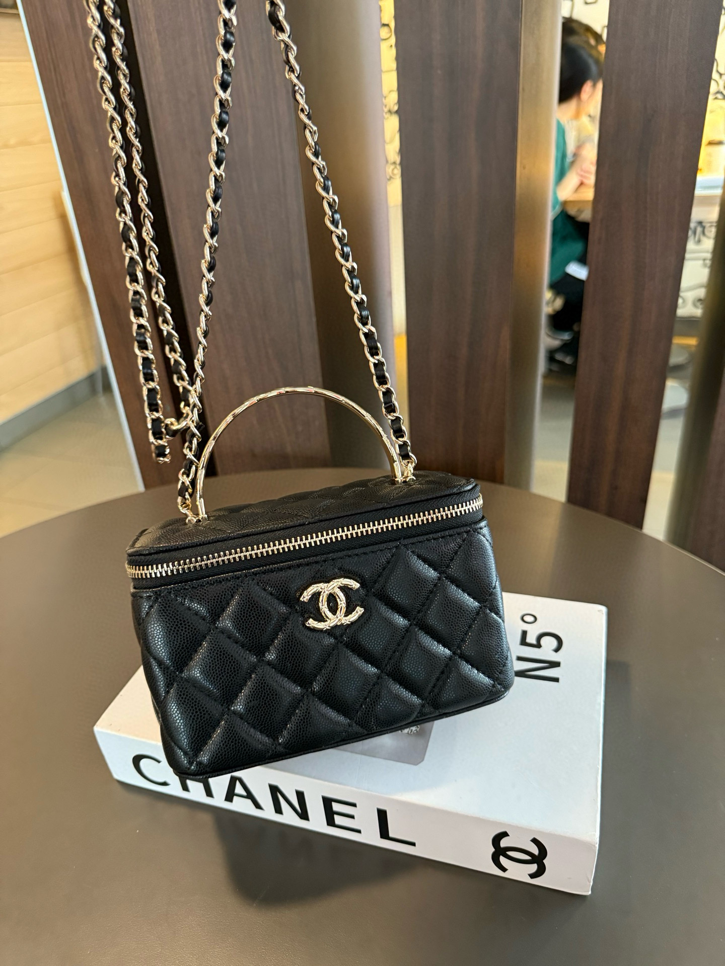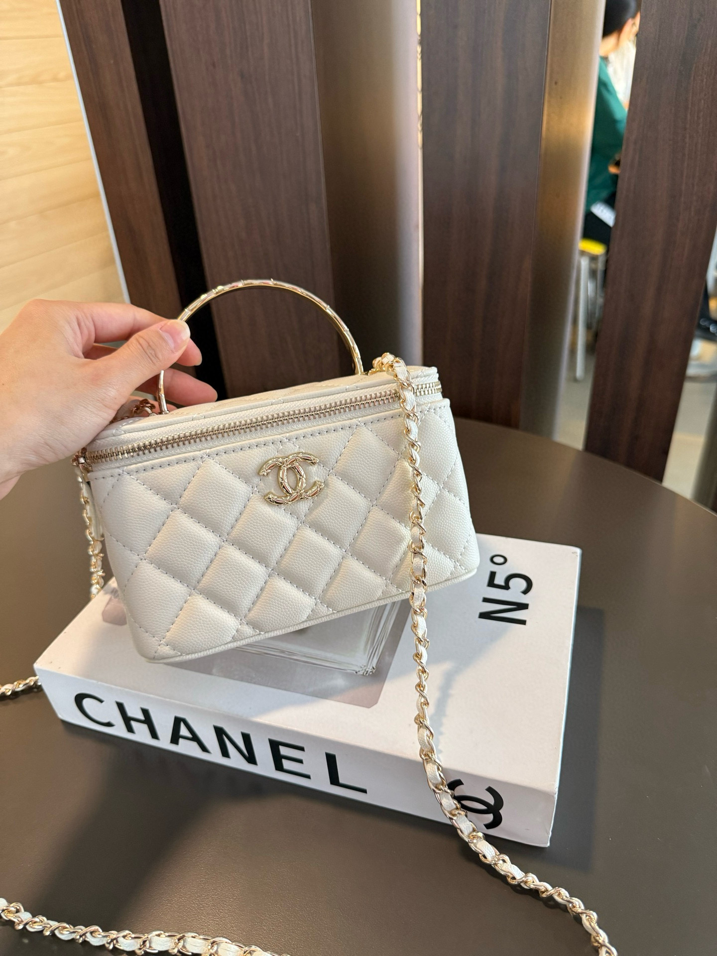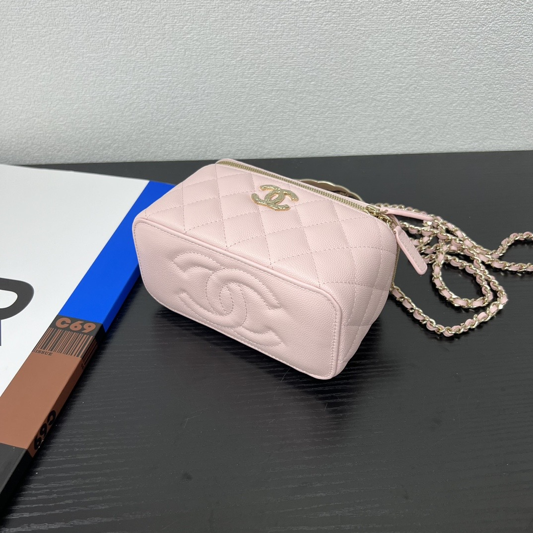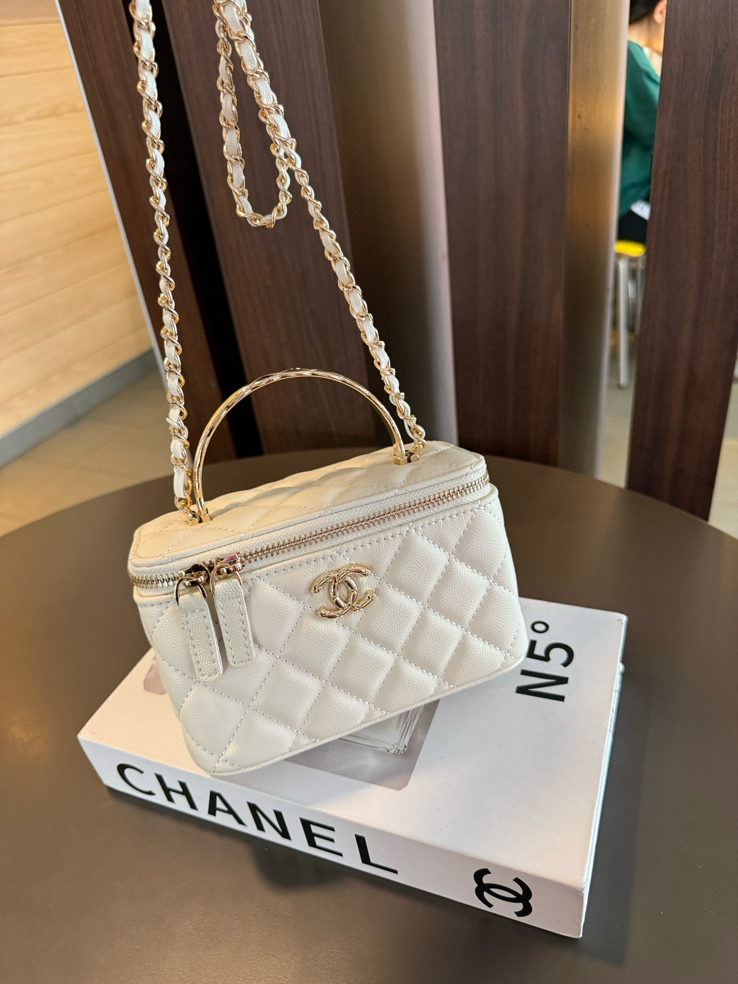 長さ調節不可のレザーとメタルのチェーン、ダブルCロゴは、その伝統を継承し、ボックス型のシルエットが特徴です。