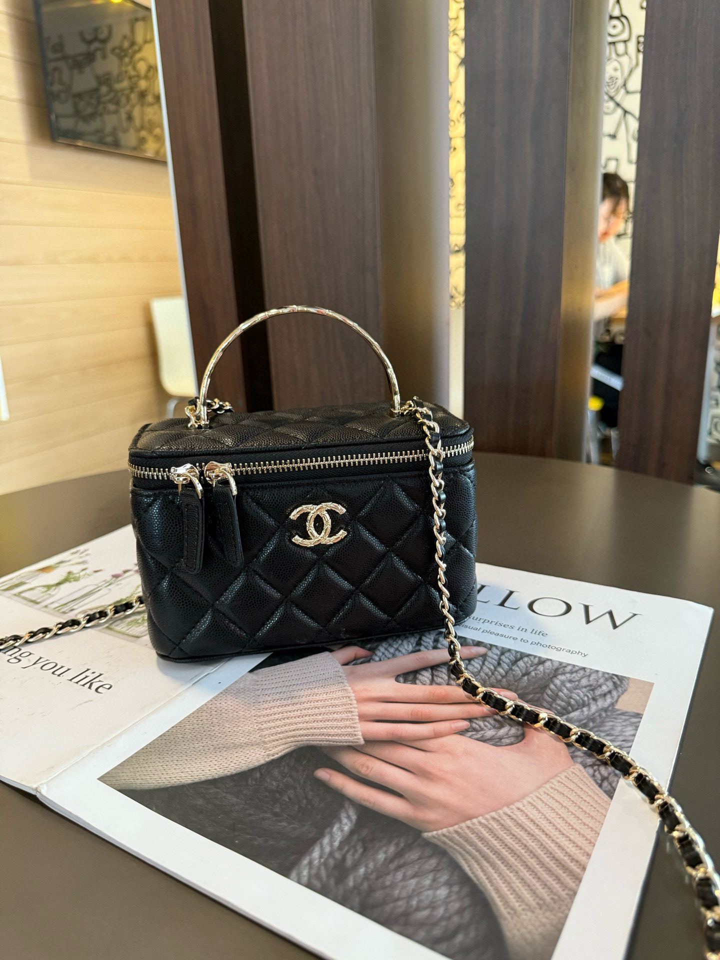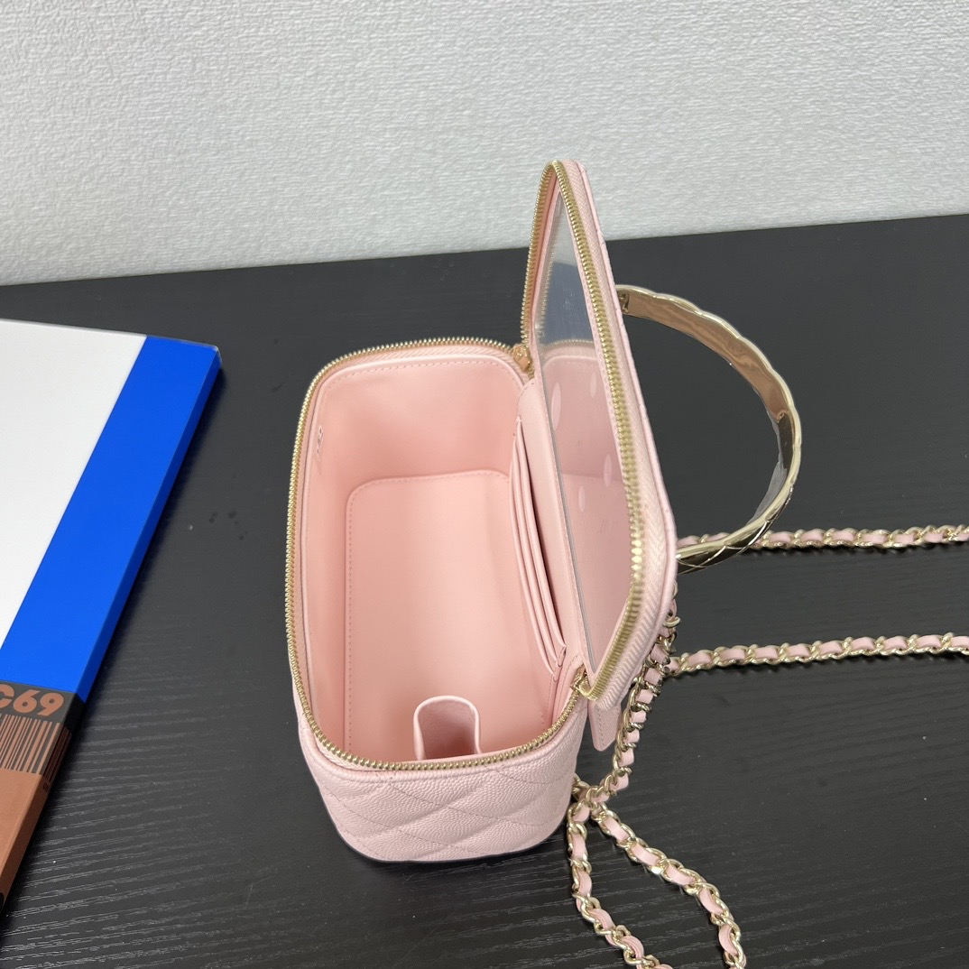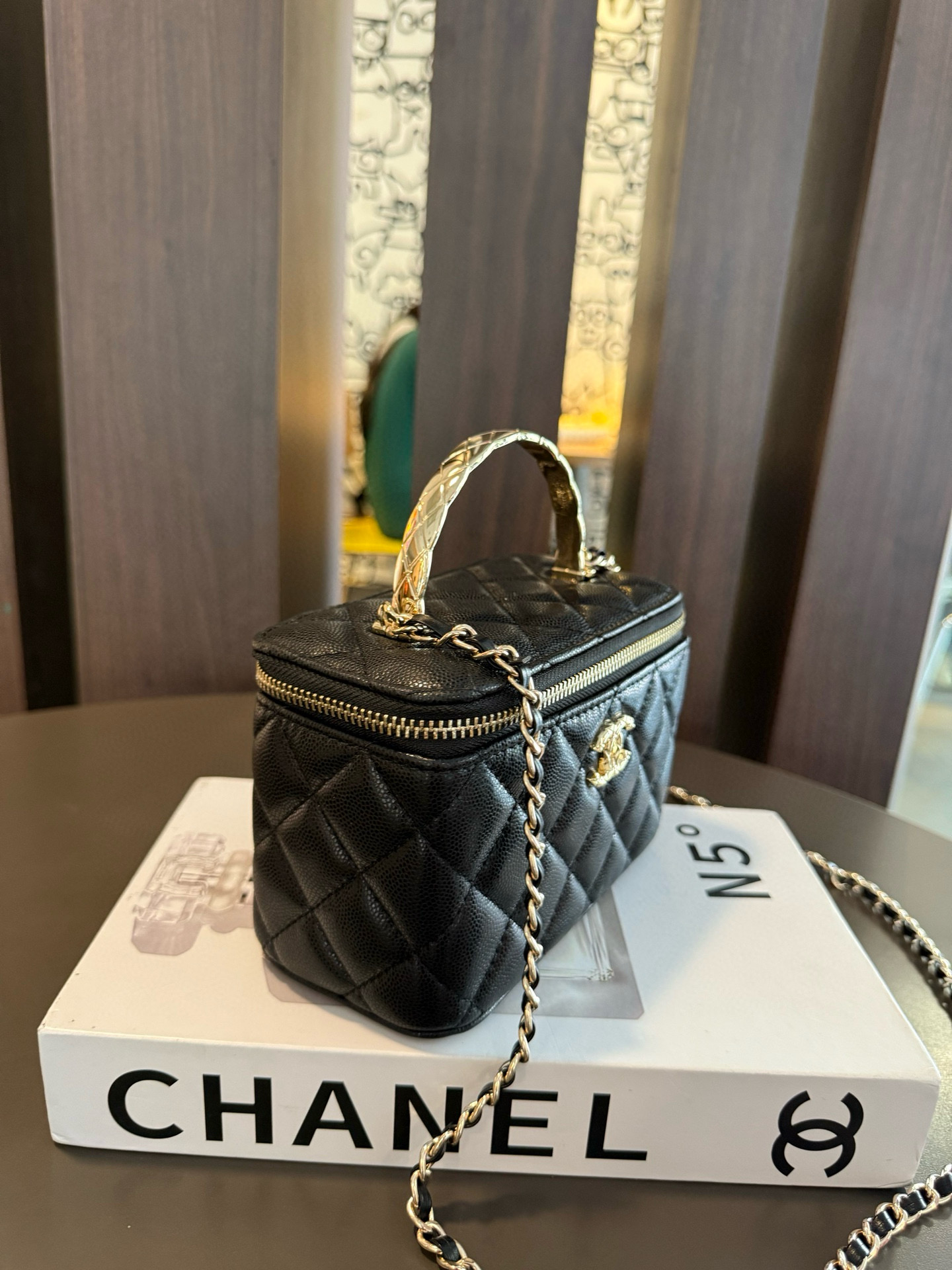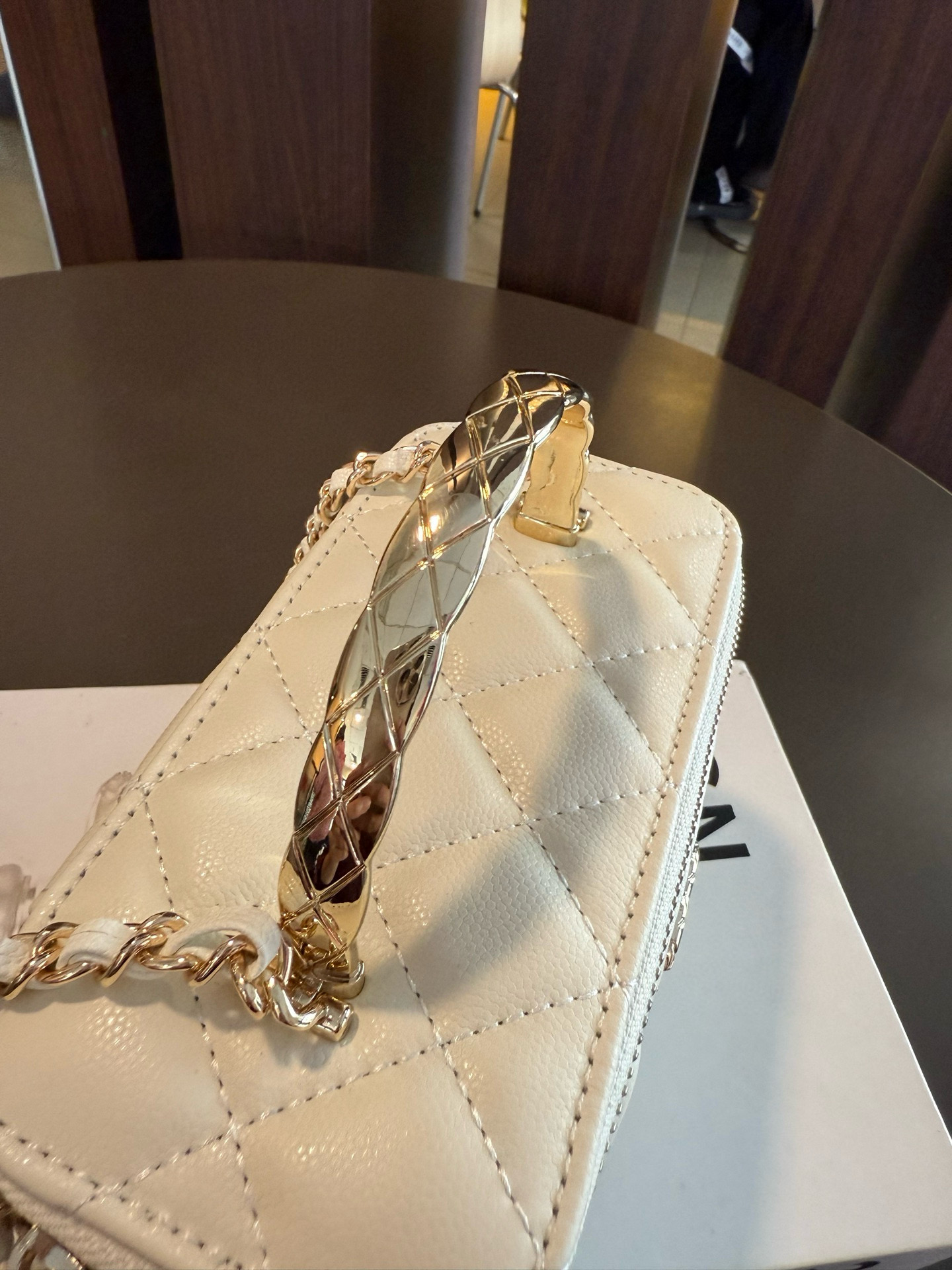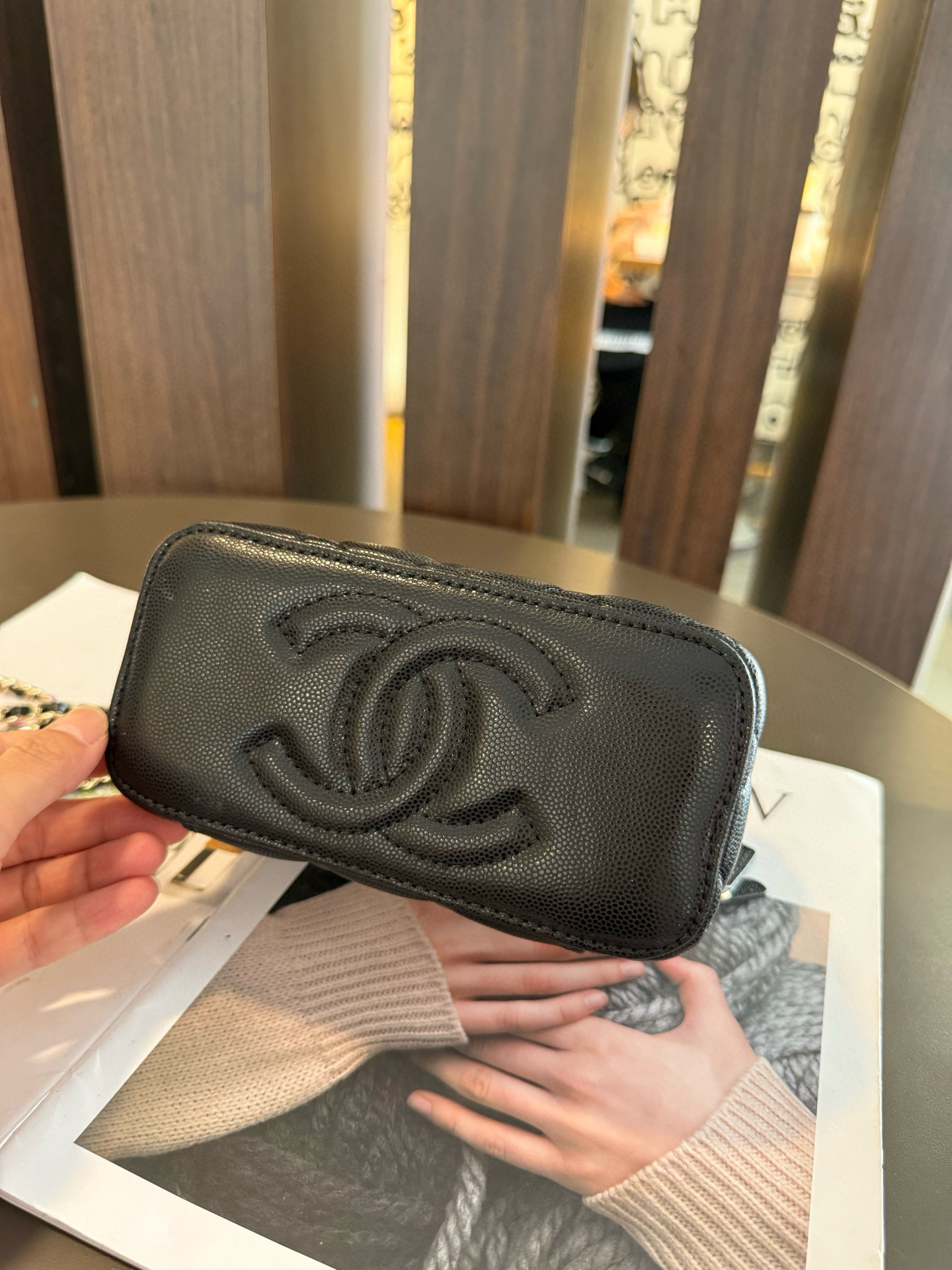 長さ調節不可のレザーとメタルのチェーン、ダブルCロゴは、その伝統を継承し、ボックス型のシルエットが特徴です。