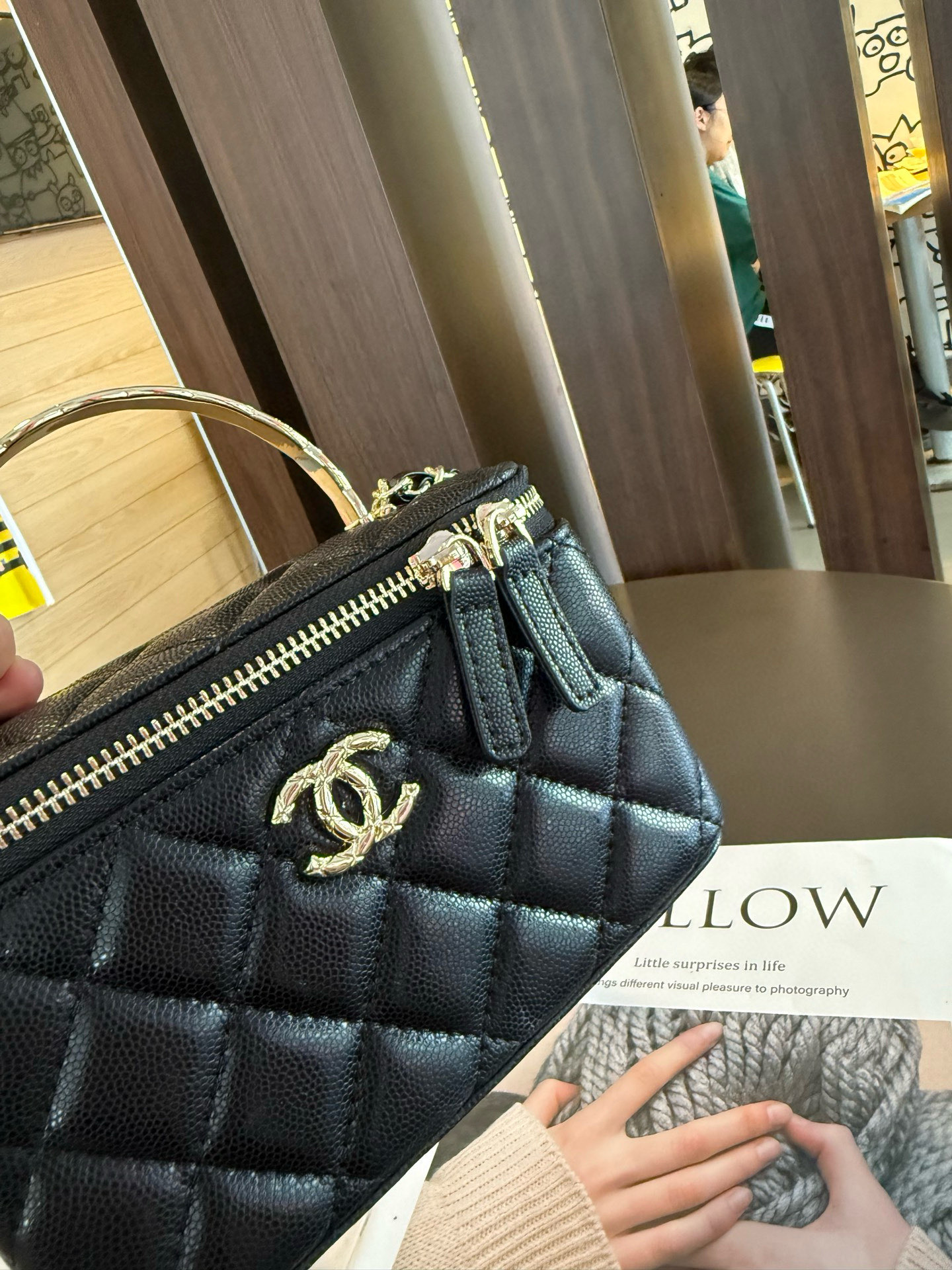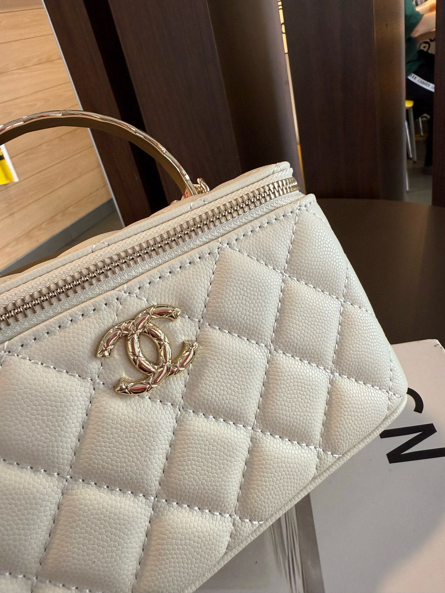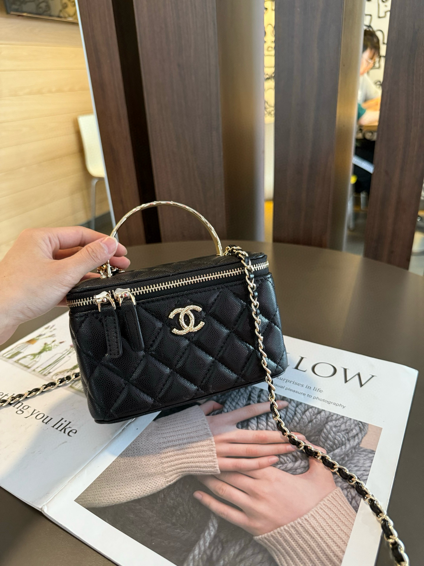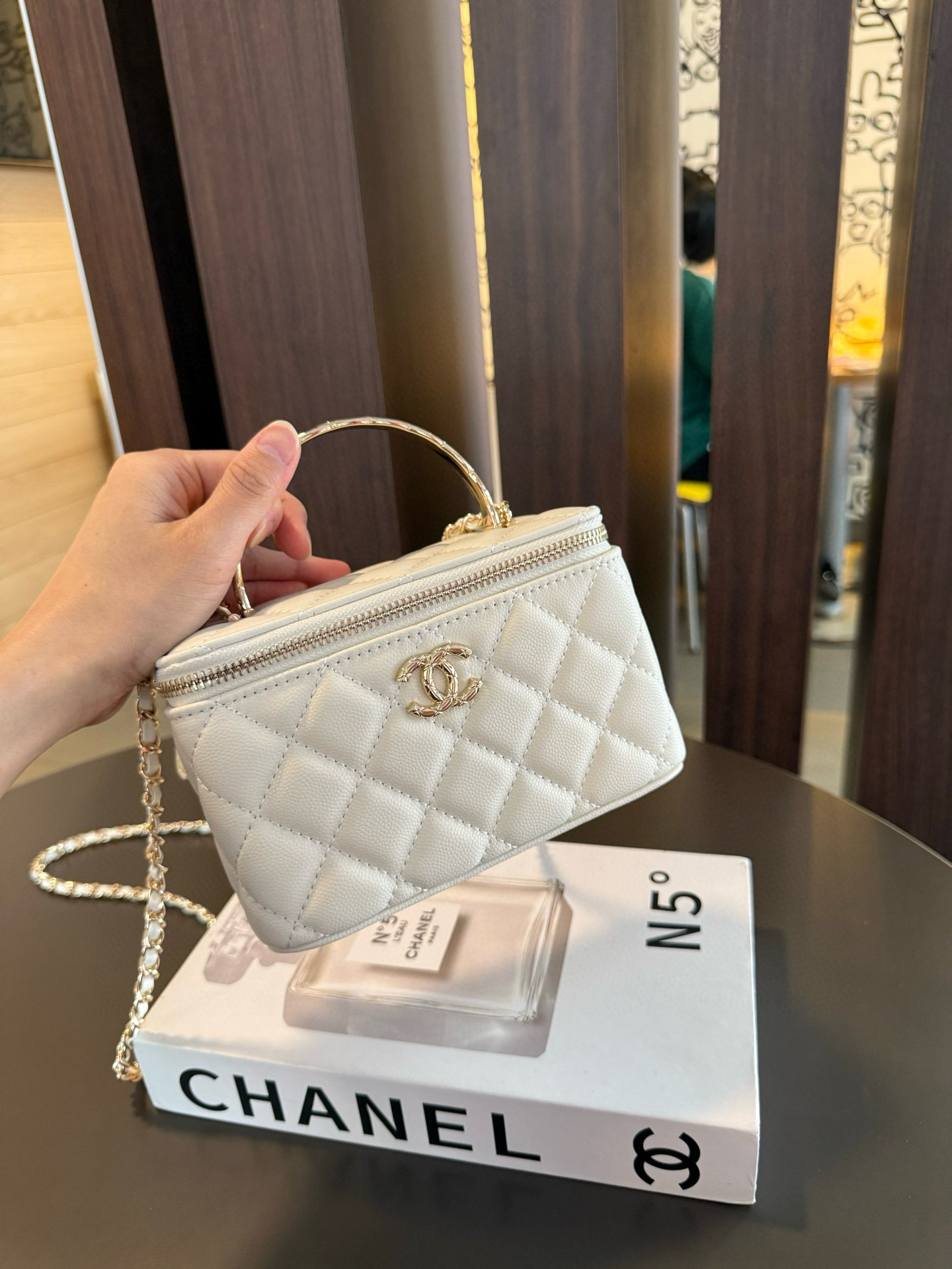 長さ調節不可のレザーとメタルのチェーン、ダブルCロゴは、その伝統を継承し、ボックス型のシルエットが特徴です。