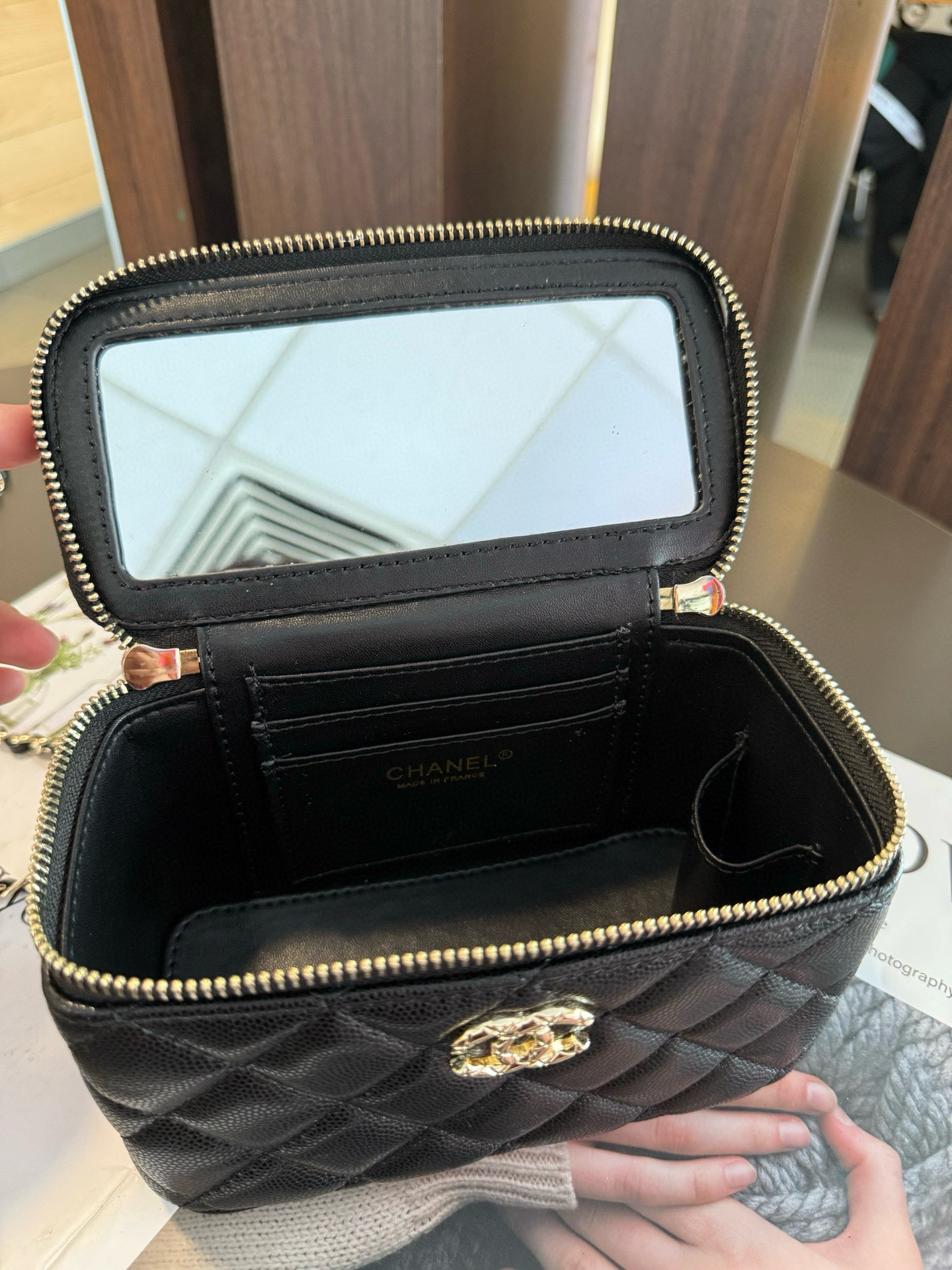 エレガントに手持ちできるだけでなく、ミラーも内蔵。