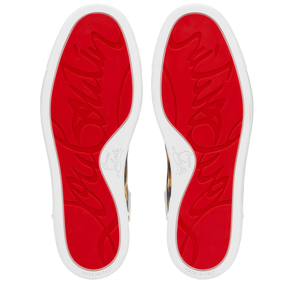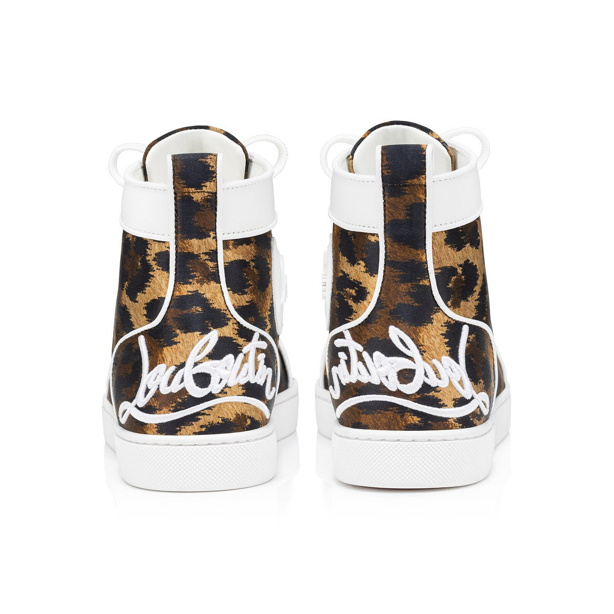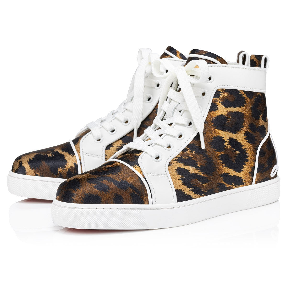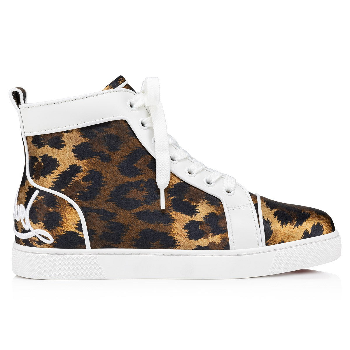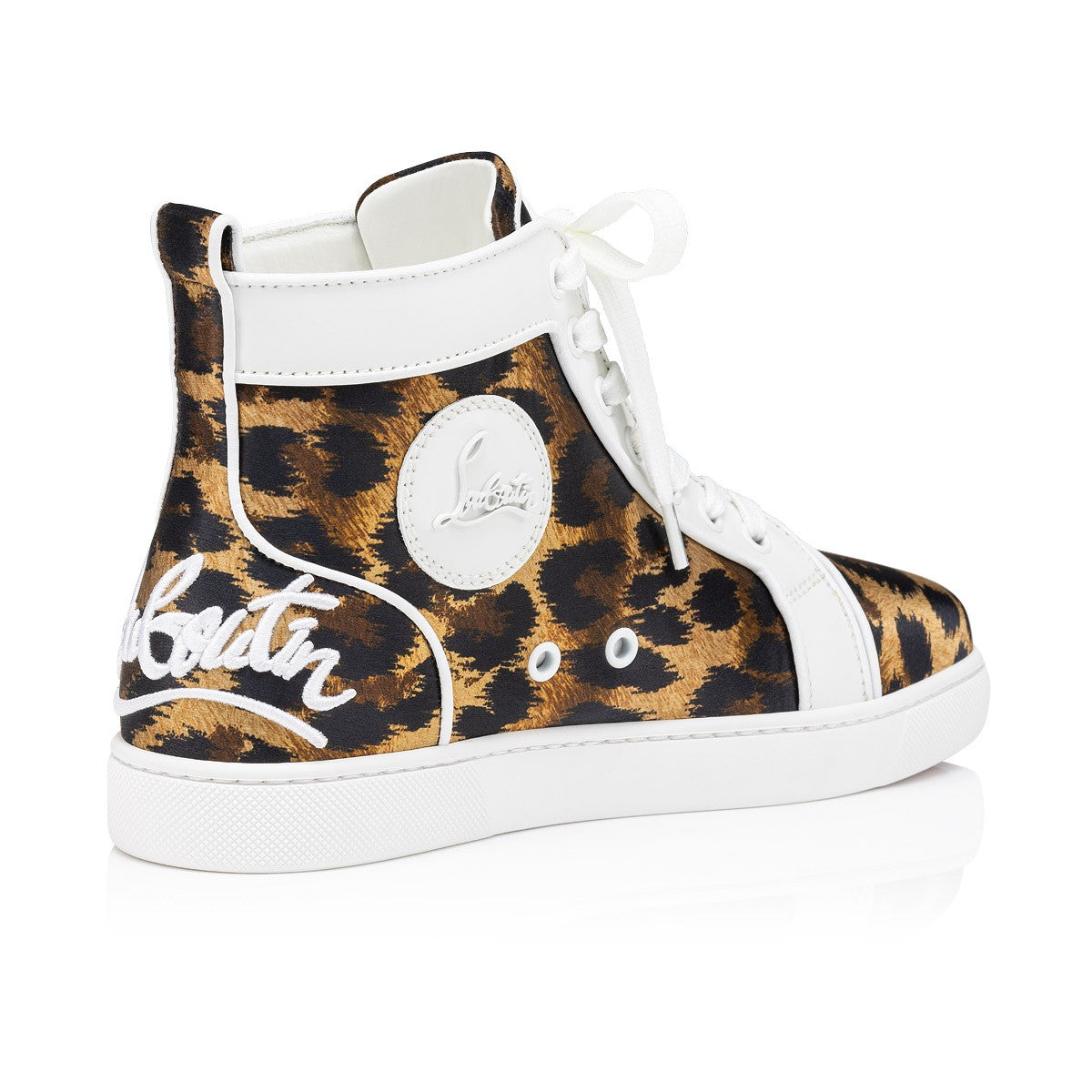 Taking its cue from the timeless high-top, the Fun Louis women's s sneaker deftly combines retro style with contemporary design elements. The upper is crafted from leopard print Crepe Satin Kitty. For a striking effect, the eyestay is in white calf leather, while the heel counter features a white Louboutin signature logo, embellished with a grosgrain trim. For that inimitable touch of Maison Christian Louboutin flair, the white creeper sole grounds the overall effect.