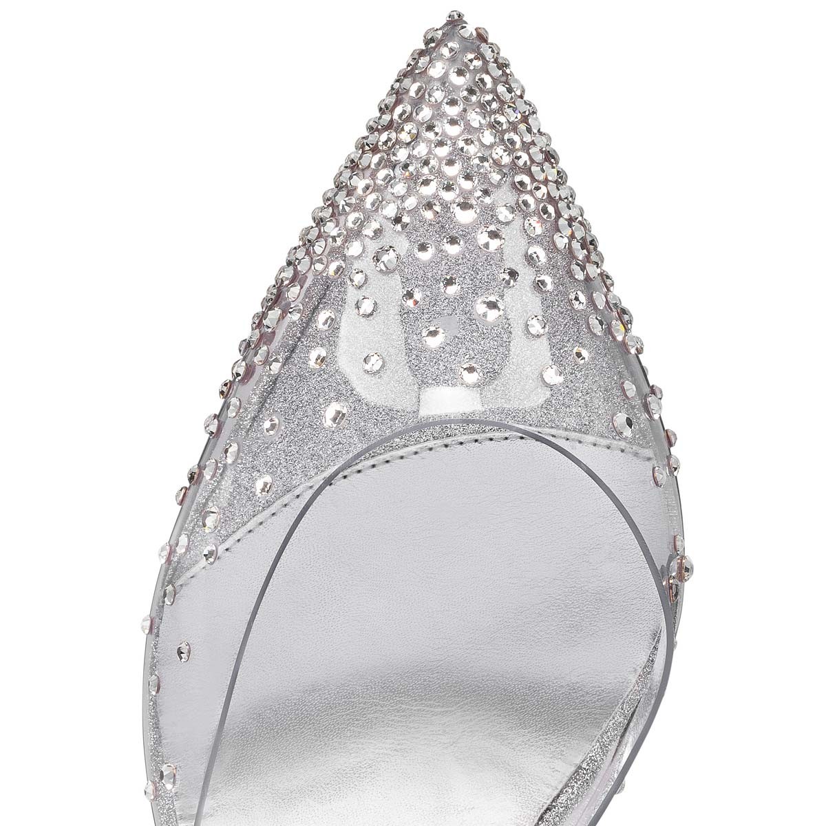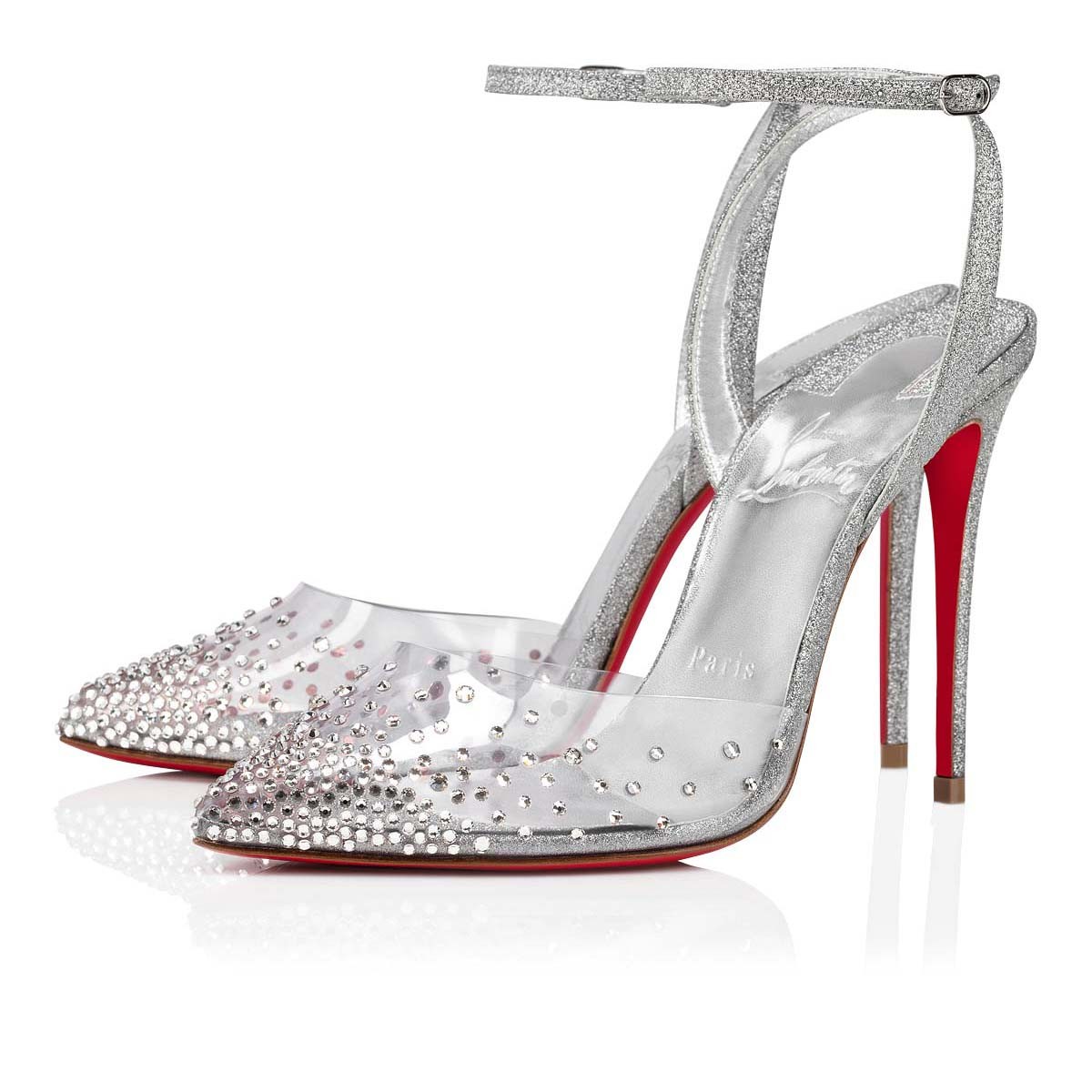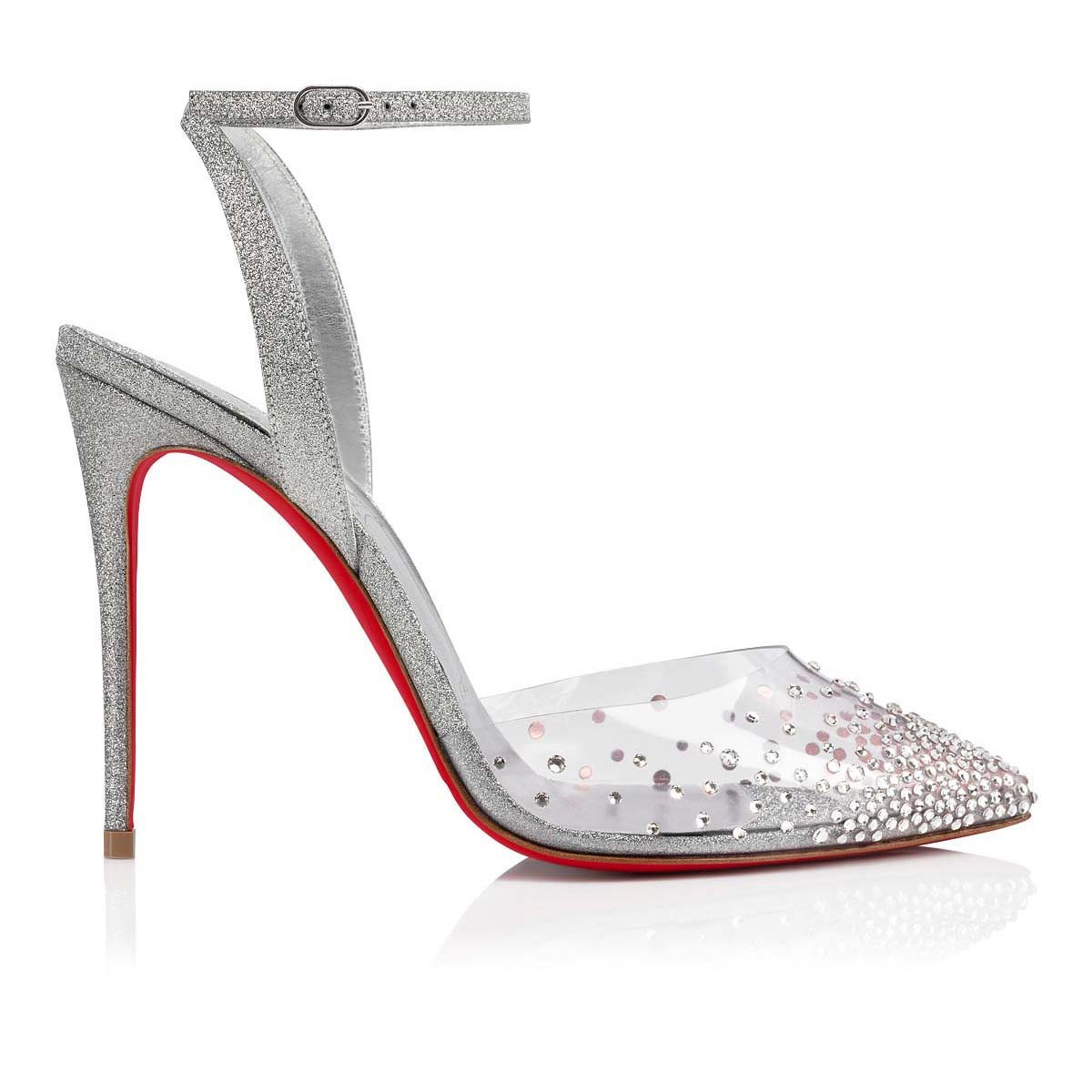 Taking its cue from an iconic Maison Christian Louboutin model, the Spikaqueen seamlessly combines the Degrastrass toe with a dainty ankle strap, to create a stunning closed-toe sandal. The wrap-around ankle strap is crafted from calf leather coated in silver-tone glitter, perched over a 100 mm stiletto heel, clad in the same material. Transparent PVC forms the “glass slipper” toe piece, appliquéd with a dégradé strass embellishment.
