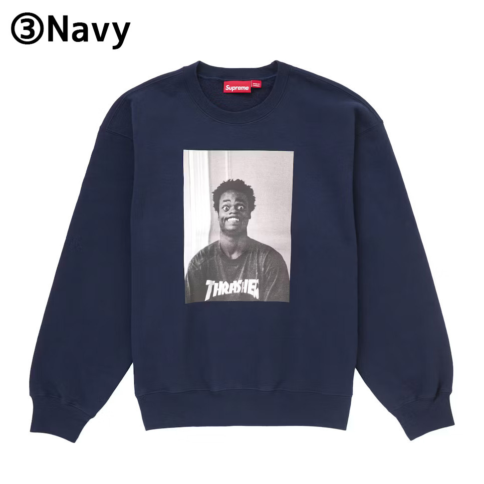 プロスケートボーダー兼俳優のHAROLD HUNTER(ハロルド・ハンター)のフォトが正面に、THRASHERのリバースロゴが背中に配置されたクルーネック・スウェットシャツ