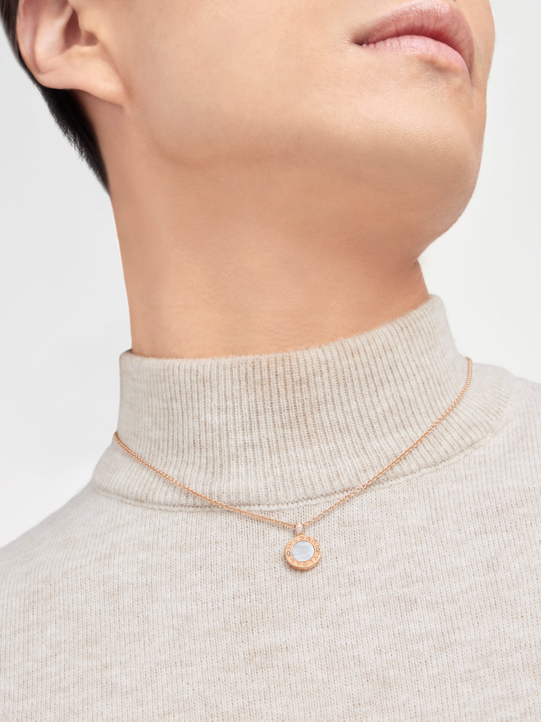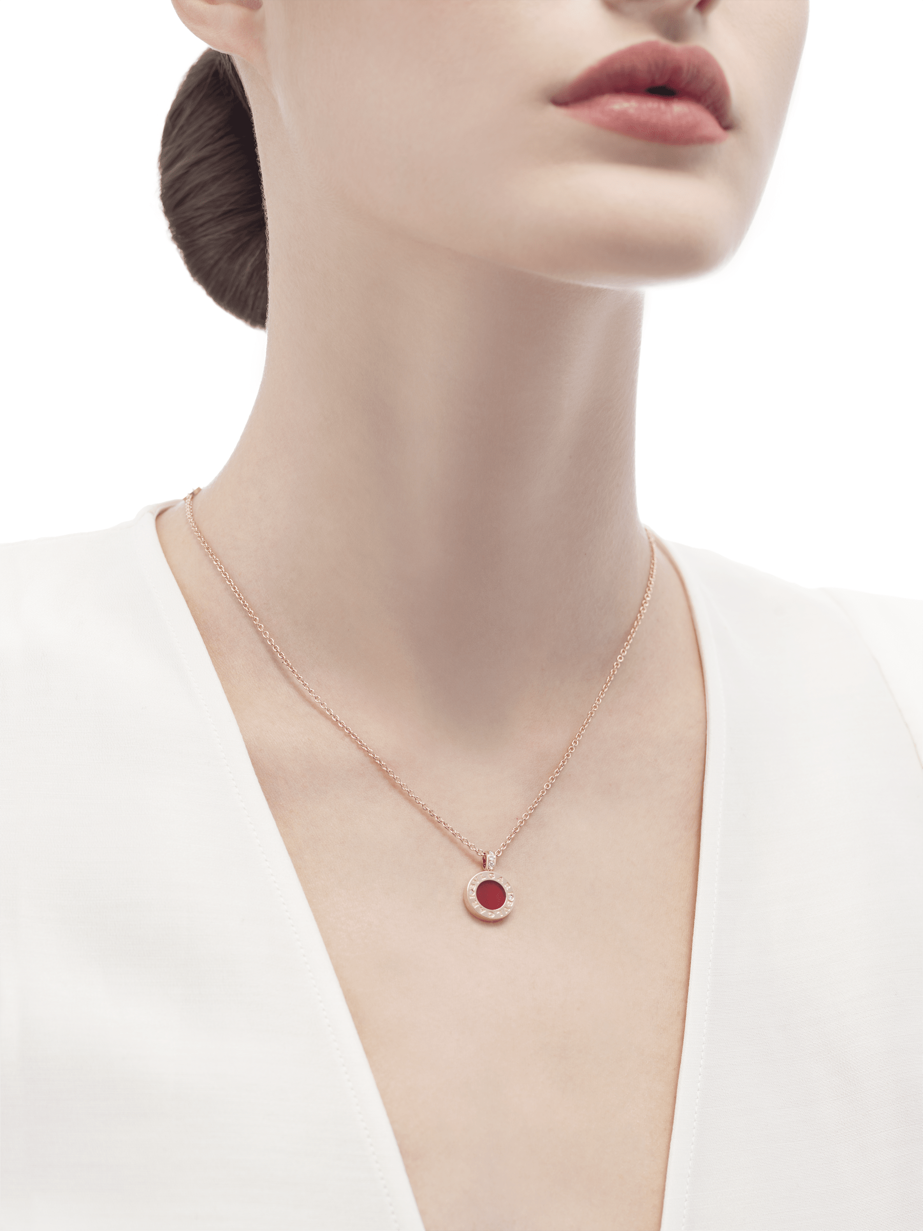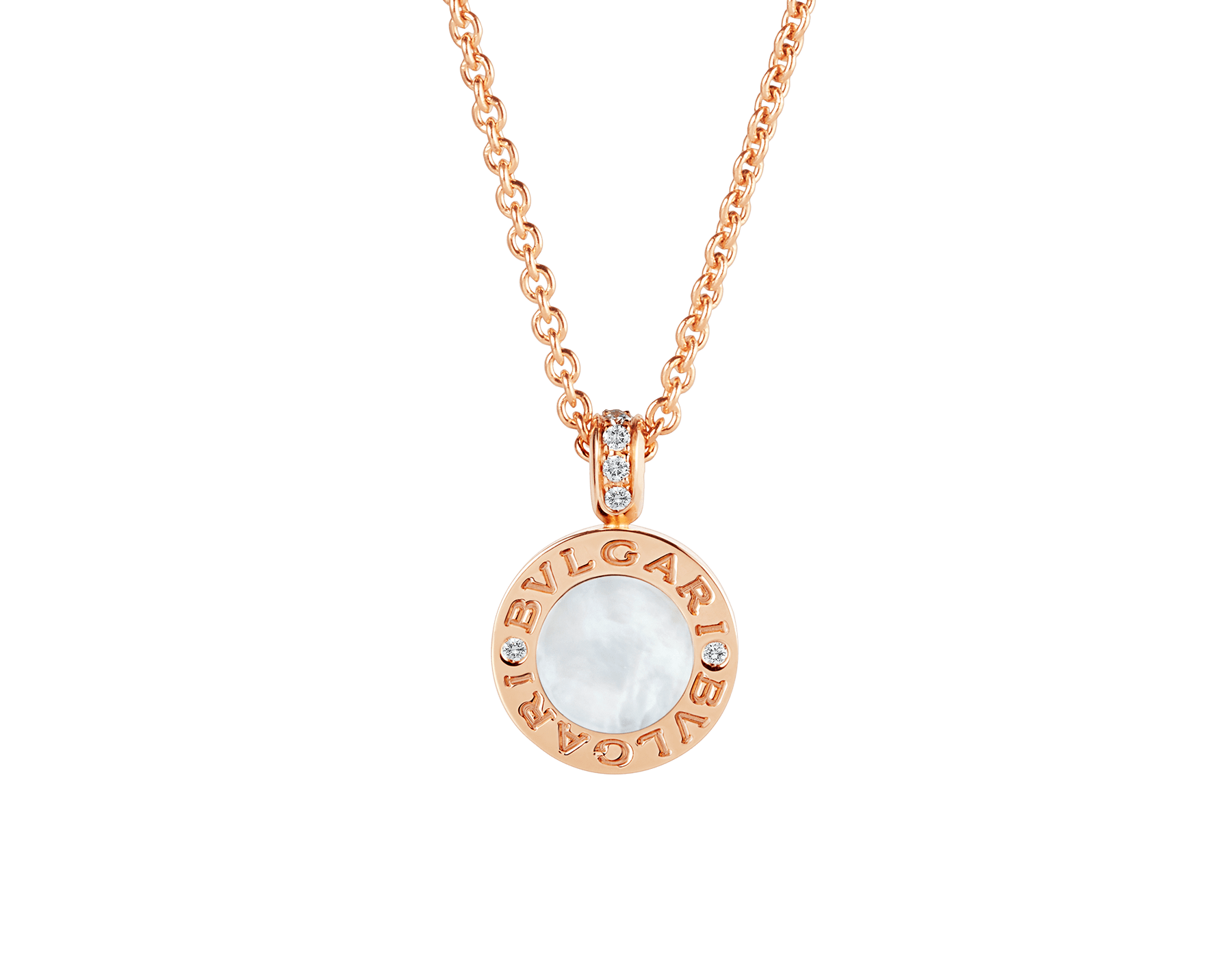 エレガントなダブルフェイスのブルガリ・ブルガリ ネックレス。マザー・オブ・パールとカーネリアンのラウンドインサート。両面とも同じ美しさを誇ります。ローマをルーツとしたブランドは、歴史的文化とモダニティを独自に融合するブランドに成長。ブルガリ・ブルガリ コレクションは、ブルガリのスタイルのエッセンスを明示します。古代ローマのアンティークコインに刻まれた文字を彷彿とさせるダブルロゴ。ジュエリーデザインの有名なエンブレムとなった最初のロゴであり、今なおブルガリのクリエイティビティを象徴する永遠のトレードマークの1つです。 カーネリアン、マザー・オブ・パールとパヴェダイヤモンド(0.12カラット)を使用した18Kピンクゴールド製ブルガリ・ブルガリ ペンダント。
