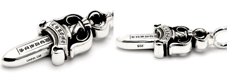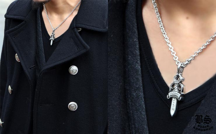 ペーパーチェーンネックレスや、NEチェーンネックレスを通して身に着けることを前提として作られたアイテムで、まるで本物のダガー(短剣)を思わせるような立体的フォルムが特徴。両面に彫り込まれた【CHROME HEARTS】の刻印でブランドアピールも表現されて、まさにクロムハーツらしいペンダントに仕上がっている。