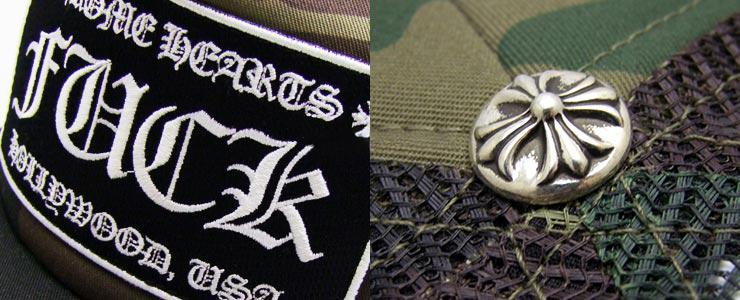 そして、フロント部分に縫い付けられた「FUCK」の文字がクロムハーツらしく、ハードな印象も与えてくれます。同じカモフラ柄のキャップで、「CH」のロゴが刺繍されている種類もございますが、よりクロムハーツらしいハードさを求める方にはこちらのキャップがおすすめです。