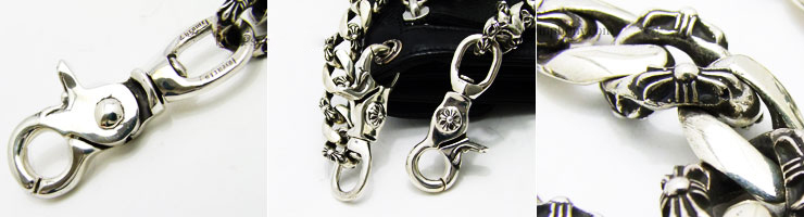プレーンなチェーンと、細やかな技工が光る小さなクロスが模られたチェーンとが交互に交差するファンシーチェーンを採用した比較的レアで、ラグジュアリー感の強いウォレットチェーン。