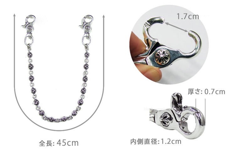 チェーンの長さは45cmとやや短めのため、クロムハーツベルトループや、キーチェーン組み合わせる上級者コーディネートがオススメ。